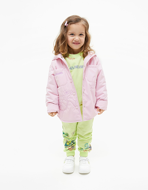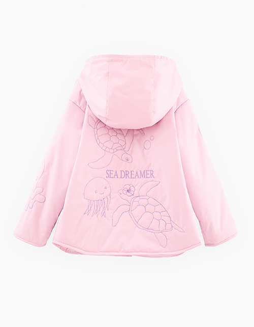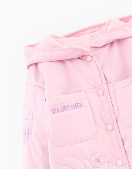 Нежный помадный розовый оттенок. Модель прямого силуэта. Комфортная застёжка на кнопки. Глубокий капюшон. Воздушная тонкая плащевая ткань. Утеплитель синтепон (80 гр). Мягкая подкладка из 100% хлопка. Сюжетная авторская вышивка.