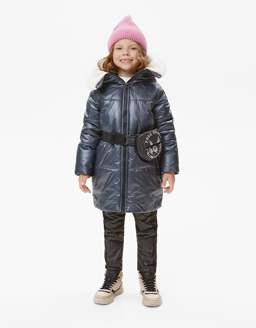 Зимняя чёрная куртка со стильной сумочкой на поясе