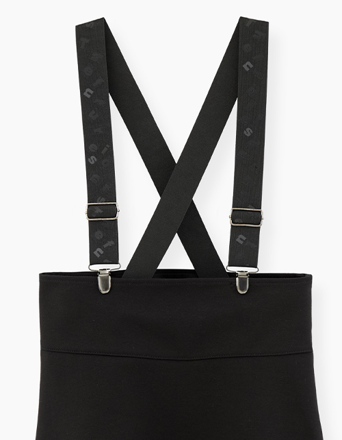 Стильная черная школьная юбка для девочки с высокой талией . Модель с регулировкой по бретелям. Юбка декорирована эластичной лентой с тематическим принтом.