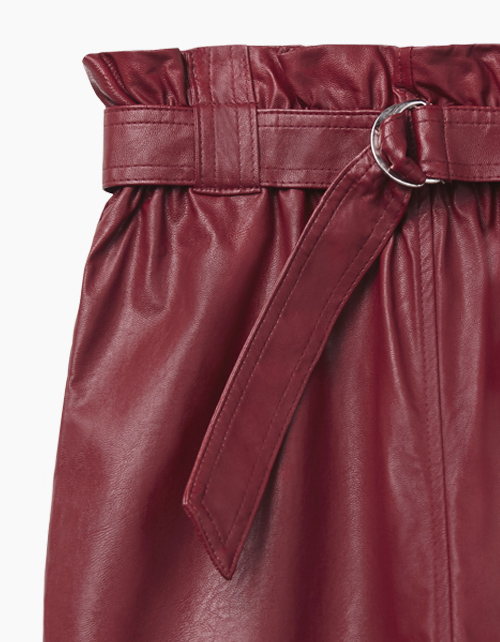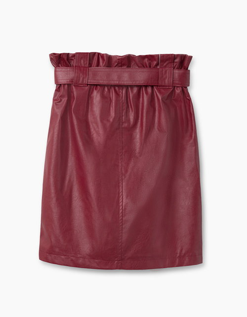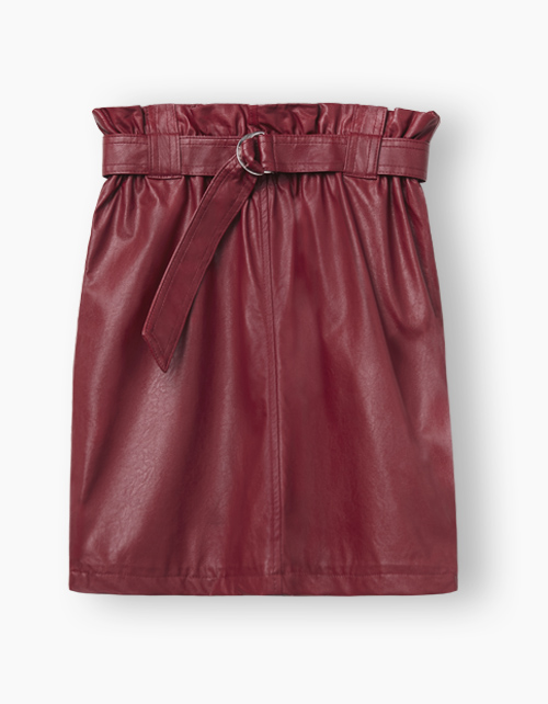 Стильная юбка из экокожи цвета спелой вишни для девочки-подростка. Стильная модель с завышенной линией талии. Пояс на эластичной ленте, с регулировкой ремешком на металлических полукольцах.