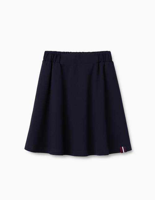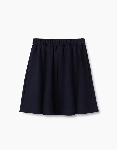 Темно-синяя расклешенная юбка из лимитированной школьной коллекции. Сделана из джерси, хорошо держит форму и не мнется. Справа снизу - небольшой декор трикотажной тесьмой, которая используется в жакетах из этой же капсулы.