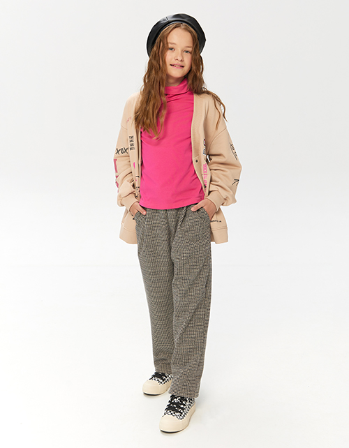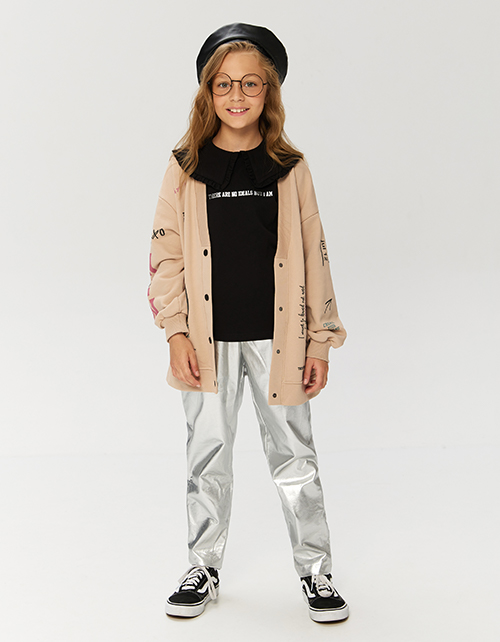 Стильный жакет-кардиган для девочки выполнен в трендовом оттенке "сливочный латте". Объемный и удлиненный силуэт. Модель декорирована эффектной вышивкой и тематическим принтом.