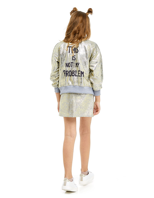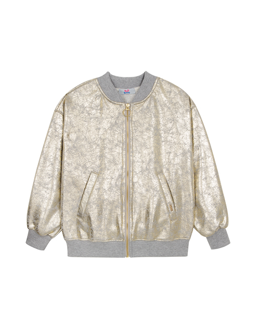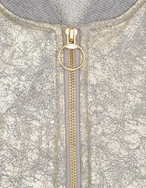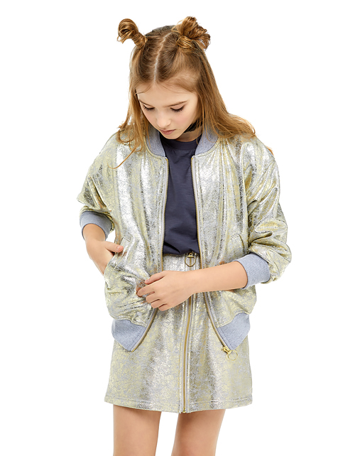 Комфортный бомбер трендового оттенка золотистый металлик с эффектом потёртости, поможет создать стильный образ, словно для обложки глянцевого журнала. Актуальный графический принт делает модель яркой и многогранной