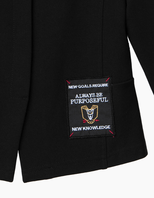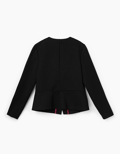 Черный трикотажный жакет приталенного силуэта для девочки. На потайной застежке. Декорирован нашивкой с надписями и фирменной эмблемой в виде совы, стрелы и открытой книги. Круглая горловина отделана контрастной тесьмой по внутренней стороне.
