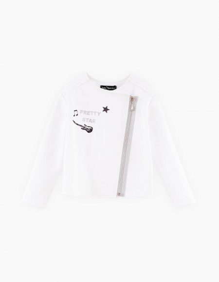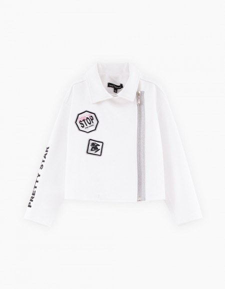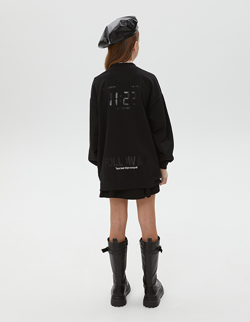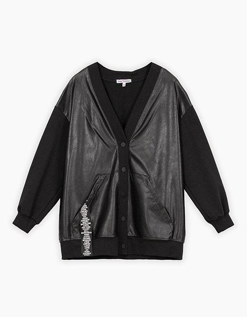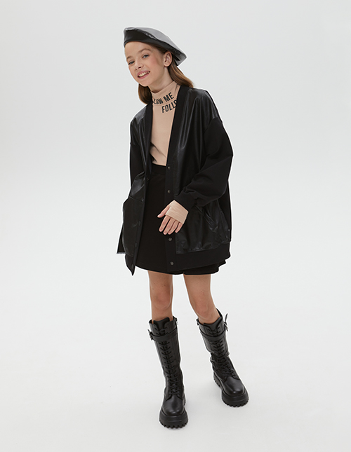 Модный чёрный жакет-кардиган для девочки. Расслабленная модель на кнопках с V-образным вырезом горловины. Манжеты из рибаны. Оригинальная комбинация: эко-кожа и футер. Жакет декорирован киперной лентой с печатью и авторским принтом по спинке на полутонах.