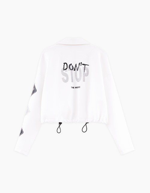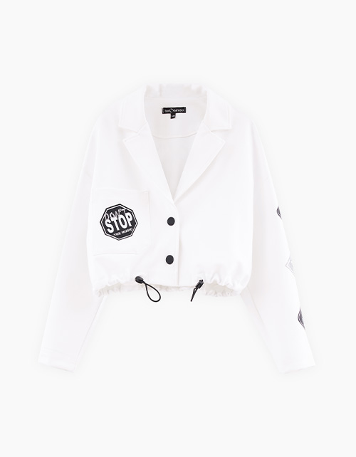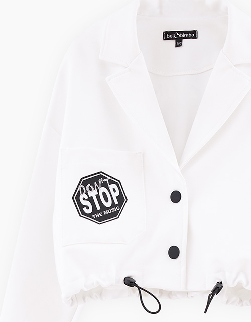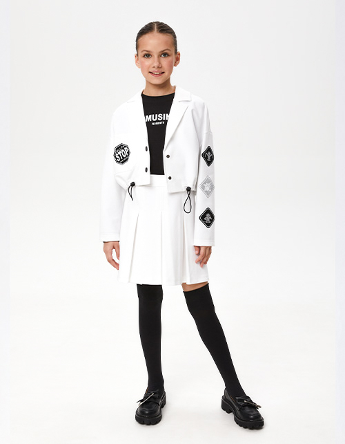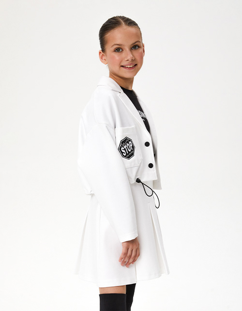 Дизайнерский укороченный жакет молочного оттенка для девочки. Модель прямого объёмного силуэта, с утяжкой спереди. Застёжка на кнопки. Спущенная линия плеча. Накладной карман. Жакет декорирован авторскими принтами.