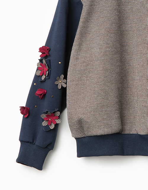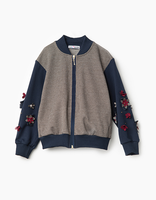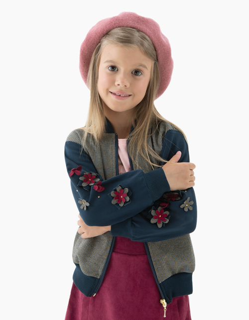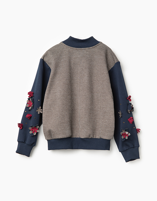Жакет-бомбер для девочки выполнен из двух видов трикотажа, один из которых имитирует клетчатую ткань, другой - джинс. Акцент в виде золотистой застежки-молнии. Рукава расшиты объемными цветами с золотыми стразами.