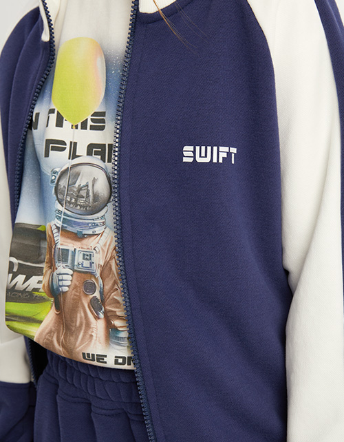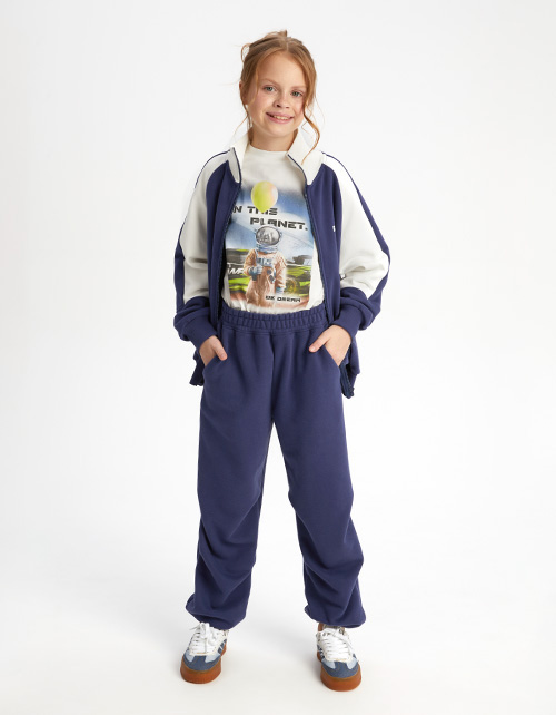 Стильный жакет-олимпийка из тактильно приятного материала для девочки. Комфортная прямая модель. Рукав-реглан. Манжеты и низ изделия из мягкой эластичной рибаны. Застёжка на молнию. Изделие дополнено карманами в шве. Контрастная вставка и авторский декор.