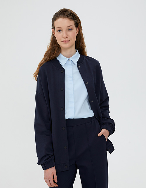 Стильный тёмно-синий жакет-бомбер для девочки. Модель оверсайз. Спущенная линия плеча. Воротник из эластичной рибаны. Манжеты и низ изделия со сборкой на резинке. Карманы в боковых швах. Комфортная застёжка на кнопки.