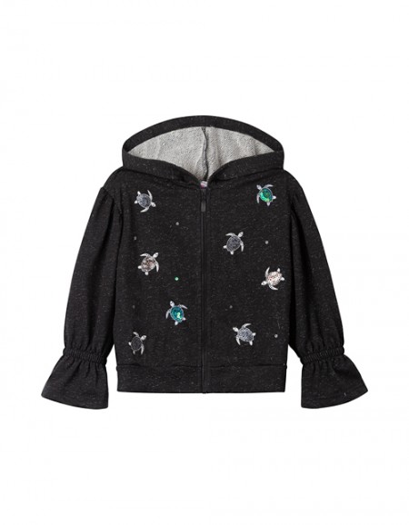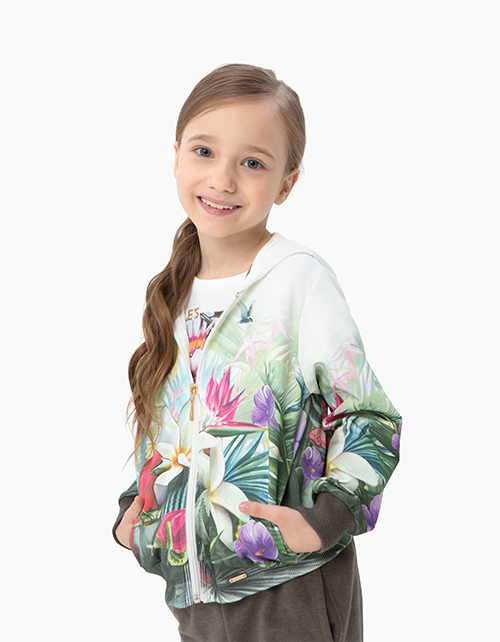 Оригинальная толстовка свободного силуэта с полноцветным набивным рисунком в тропической тематике. С застежкой на молнию. Основная ткань - футер. Манжеты выполнены из рибаны цвета хаки, отделка по низу - из рибаны с набивкой