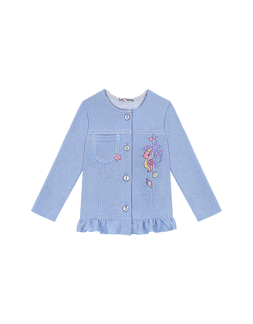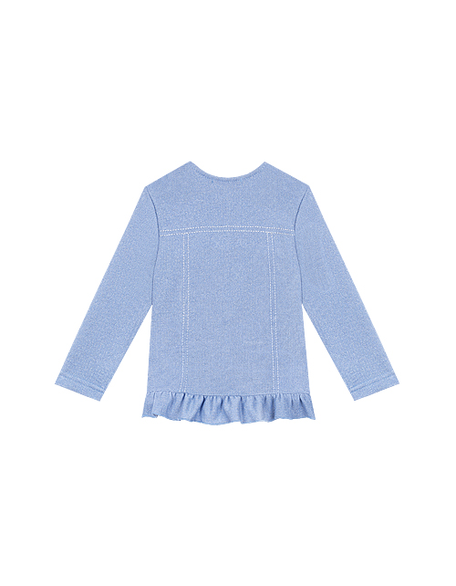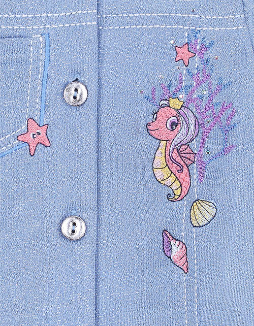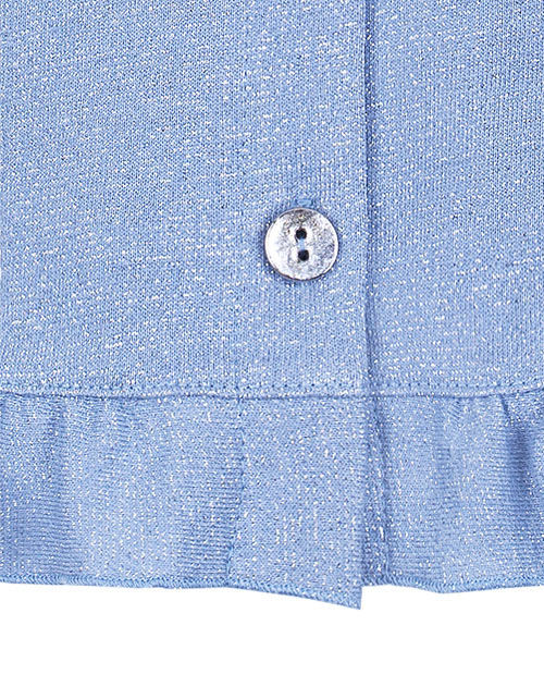 Голубой жакет для девочки. Полотно с включением мягкой люрексовой нити. Оформление в стилистике капсулы "Ариэлла". Стразы и серебристые пуговицы. Карман на груди. Оборка в нижней части модели.