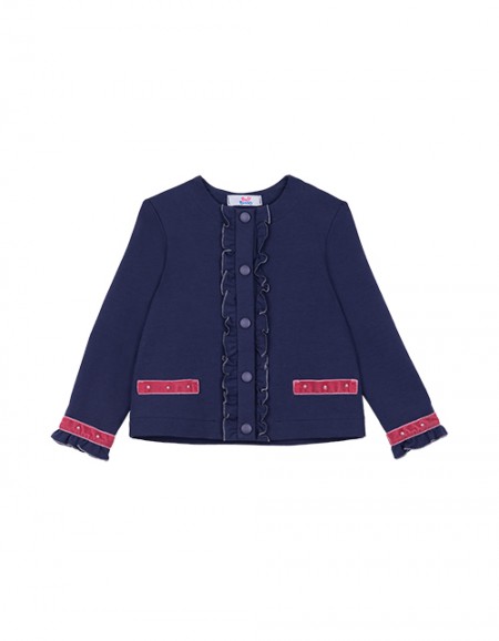 Жакет для девочки с круглым вырезом горловины. Полотно с включением мягкого люрекса. Декоративные рукава из сетчатого полотна с оборками. Дизайнерское оформление в стилистике капсулы "Модная тусовка".