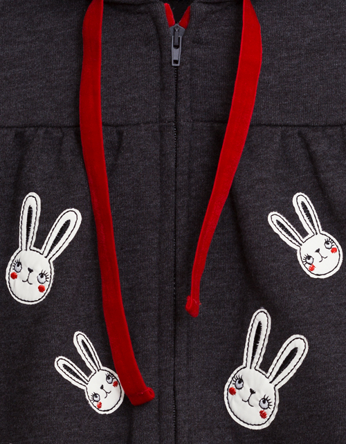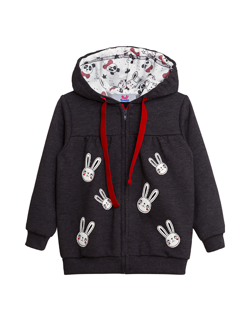 Жакет на молнии с капюшоном и кармашками из плотной ткани с мягкой подкладкой, украшенной милым рисунком зверей, понравится всем. Веселые зайцы с вышитыми ушками и щечками заставят улыбнуться малышку, а мягкие натуральные ткани позаботятся о её здоровье.