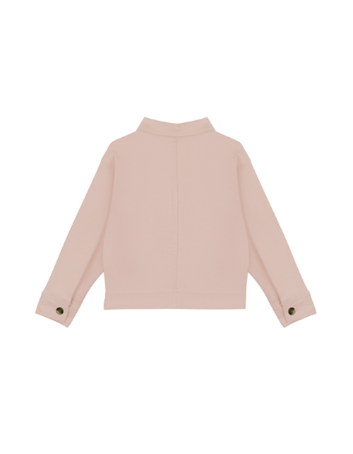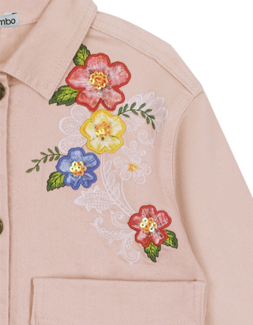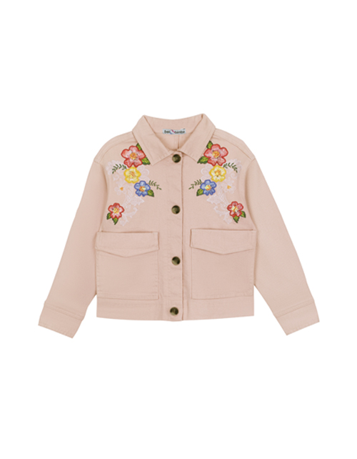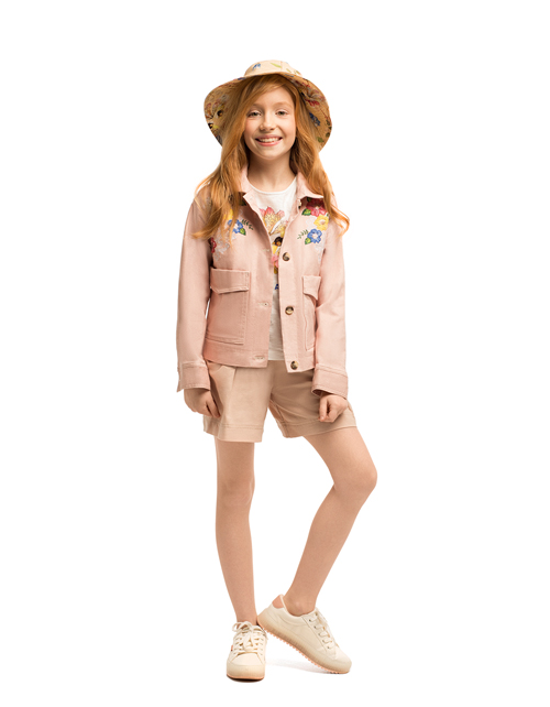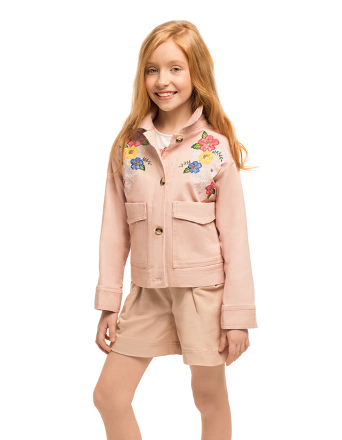 Укороченный светло-розовый жакет для девочки прямого силуэта. Большие накладные карманы, застежка на пуговицы. Декорирован вышивкой с пайетками. Оформление в стилистике капсулы "Цветочное сафари".