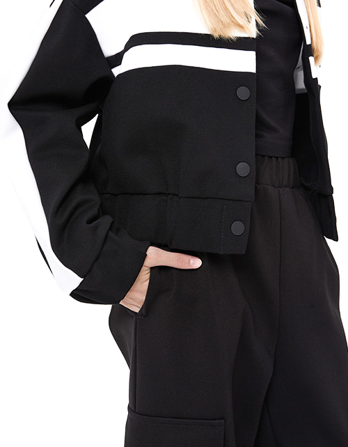 Дизайнерский чёрный жакет-бомбер для девочки. Прямая укороченная модель. Низ изделия и манжеты с эластичной тесьмой внутри. Комфортная застёжка на кнопки. Бомбер спереди и сбоку по рукавам декорирован контрастными вставками.