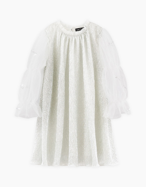 Жакет-бомбер с ноткой ретро для девочки. Прямая объёмная модель с приспущенной линией плеча. Низ и рукава на ленте с люрексом. Воротник стойка из рибаны. Застёжка на молнию. Выполнен из футера и мягкой сетки. Декорирован пайетками.