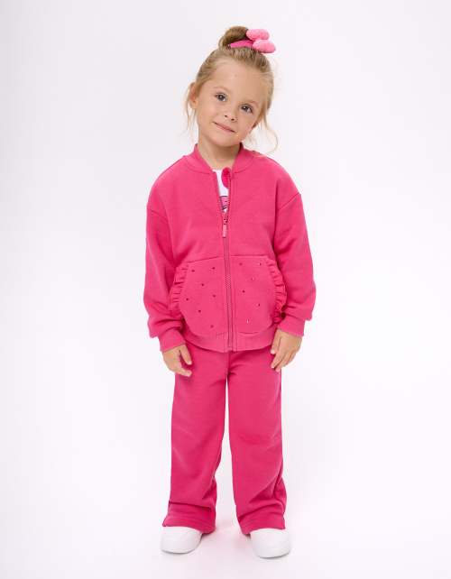 Жакет-бомбер в оттенке фуксия для девочки. Прямой силуэт с приспущенной линией плеча обеспечивает свободу движения. Мягкая эластичная рибана по низу и манжетом хорошо тянется и не давит. Накладные карманы. Декор стразами. Удобная застёжка-молния.