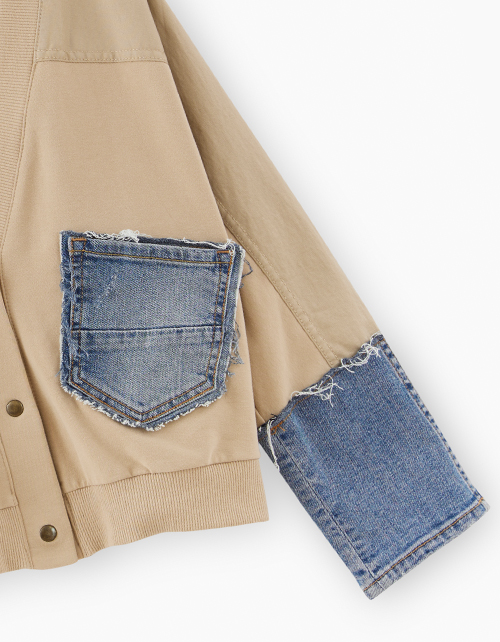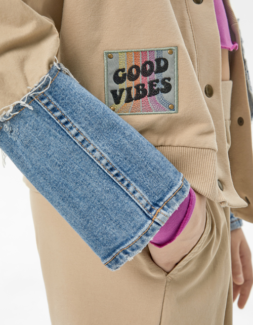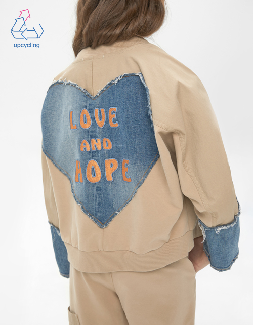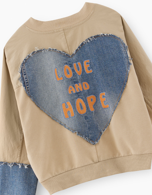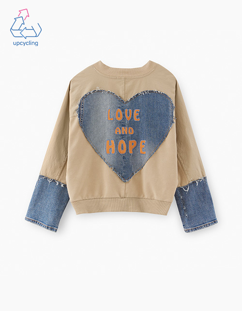Жакет-кардиган для девочки. Укороченная модель, OVERSIZE, из футера с браш-эффектом декорировано вышивкой и стразами под латунь. Оригинальный карман, рукава и аппликация на спинке - результат апсайклинга (цвет джинсовых элементов может отличаться от фото)