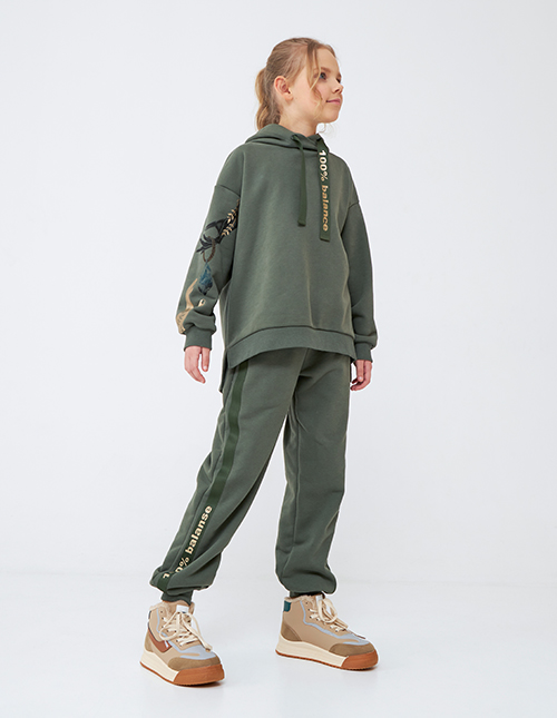 Бежевый жакет-рубашка для девочки. Модель прямого силуэта со спущенной линией плеча. Изделие на кнопках, с отложным воротником. Жакет из комбинации футера и эко-кожи. Спинка изделия декорирована авторским принтом, накладной карман - вышивкой с аппликацией