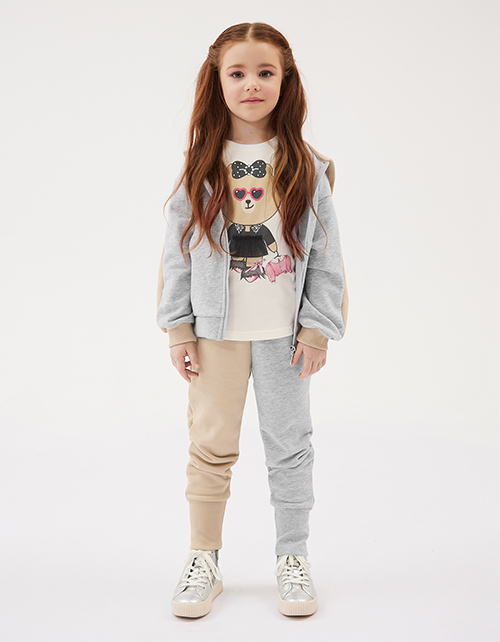 Стильный жакет-толстовка в стиле колор-блок для девочки. Комфортная модель с карманами-кенгуру и удлиненной спинкой. Жакет декорирован стразами и тематическим принтом.