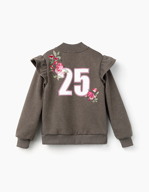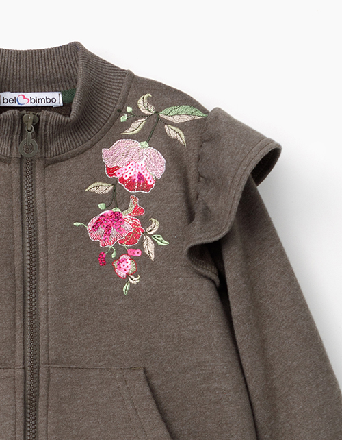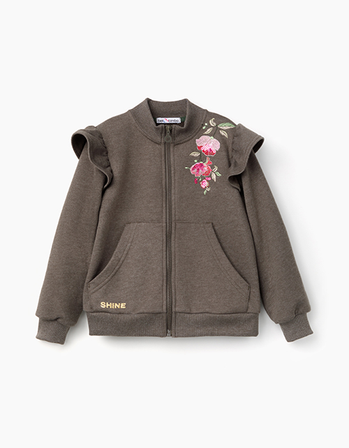 Жакет свободного силуэта на молнии. Из меланжевого трикотажа цвета хаки, с рибаной по рукаву, низу и горловине. Декоративные воланы на плечах и цветочная вышивка с пайетками придают практичной модели романтичности