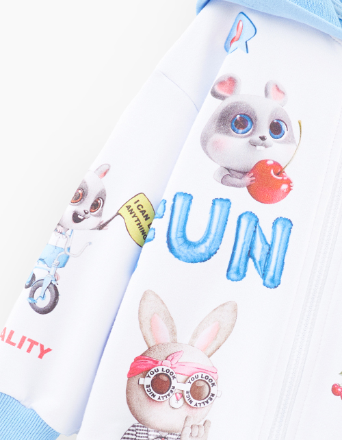 Худи на молнии для девочки. Модель в белых и голубых оттенках, с акцентными дизайнерскими принтами. Худи из тактильно приятного футера. Застёжка на молнию с защитой подбородка. Манжеты и низ изделия из рибаны. Изделие декорировано стразами.