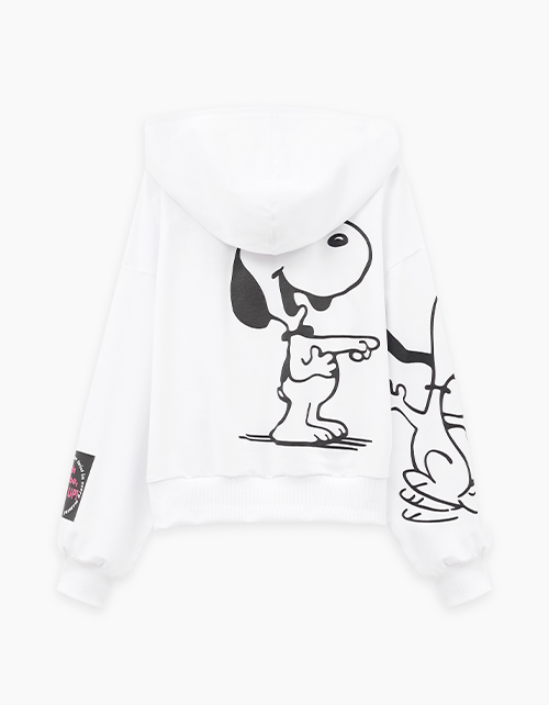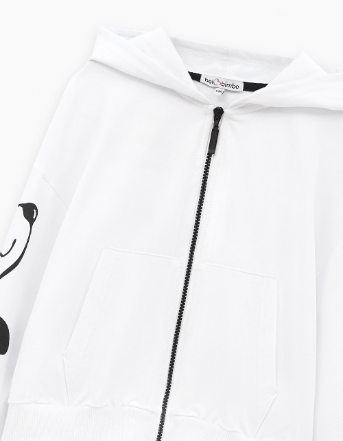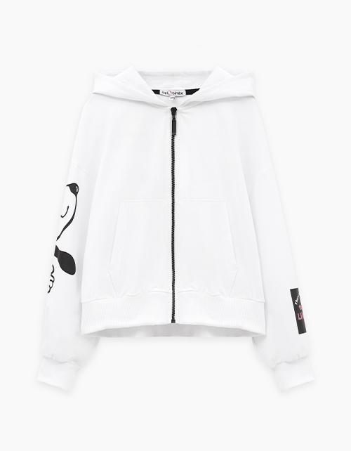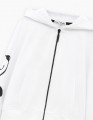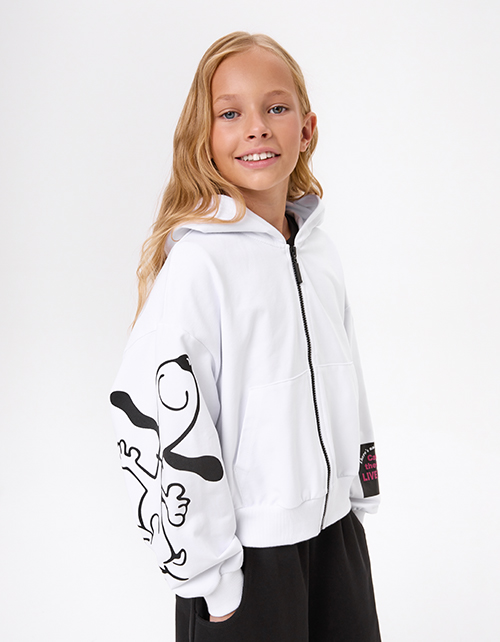 Укороченное белое зип-худи с объёмным силуэтом и приспущенной линией плеча. Глубокий капюшон с кулиркой и накладные карманы добавляют удобства. Водная шаблонная печать создаёт эффект комикса. Крафтовая лейба с бархатной плёнкой завершает дизайн.
