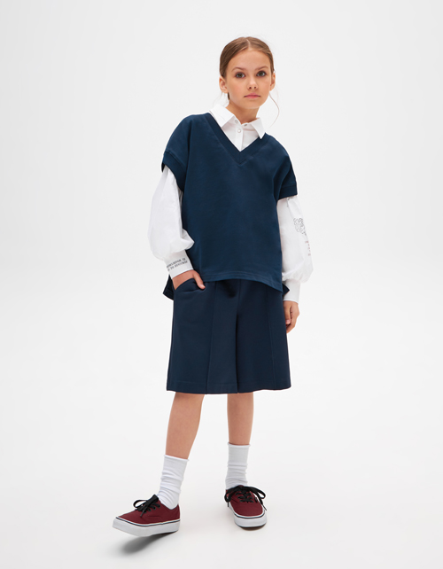Тёмно-синяя школьная жилетка для девочки. Модель прямого расслабленного силуэта до середины бедра. Изделие из футера со спущенной линией плеча и разрезами по бокам.