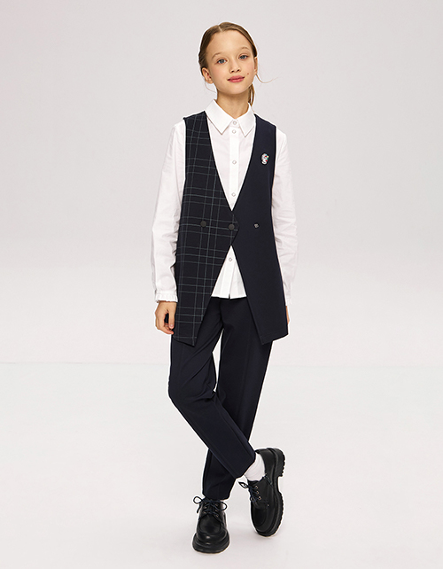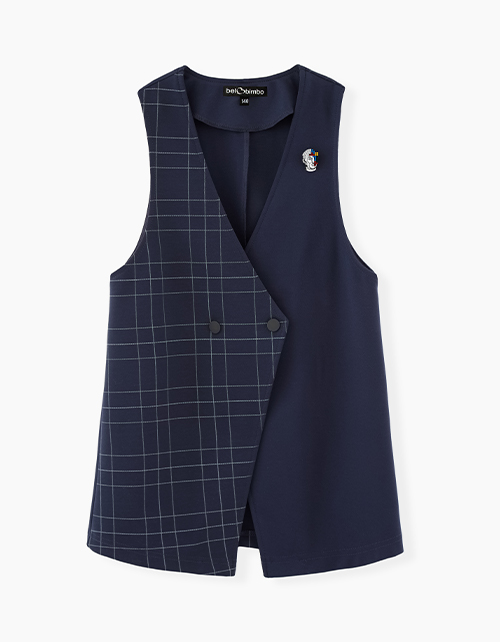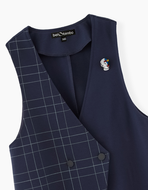 Удлиненный жилет в клетку. Комфортная повседневная школьная модель для девочки. С застежкой на кнопки. Жилет дополнен тематическим значком.