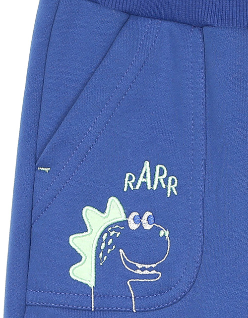Спортивные брюки для мальчика дополнены резинкой на поясе, удобными манжетами и двумя накладными карманами спереди. Один из карманов украшен принтом в виде веселого динозавра. Свободные брюки пошиты из ткани футер, удобные в носке и приятные к телу.