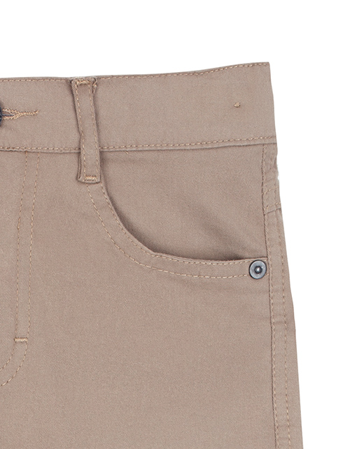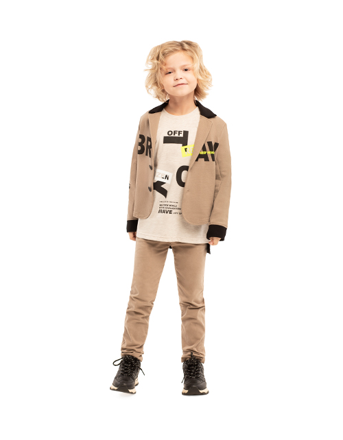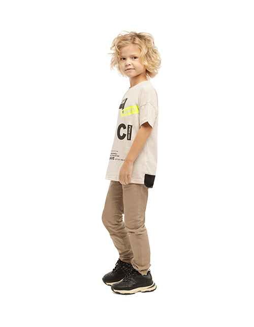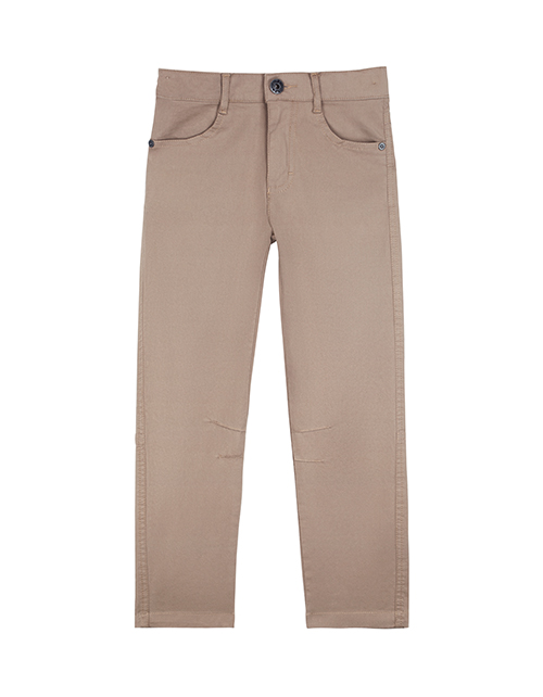 Бежевые брюки для мальчика с регулируемым поясом на эластичной ленте с петлями и пуговицами. Функциональные карманы, декорированные клепками. Дизайнерское оформление в стилистике капсулы "Новый мир".