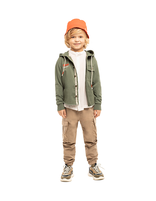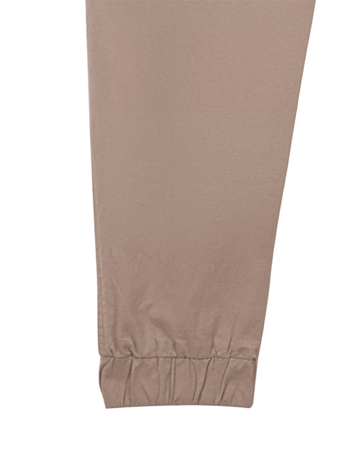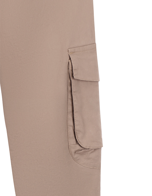 Бежевые брюки для мальчика свободного силуэта. Пояс на эластичной ленте. Накладные карманы через боковой шов с деталями-клапанами и объемной складкой. Оформление в стилистике капсулы "Нео сафари".