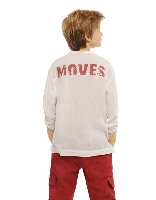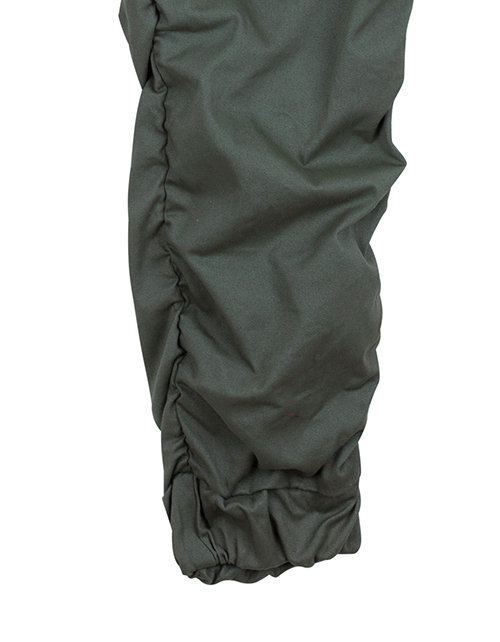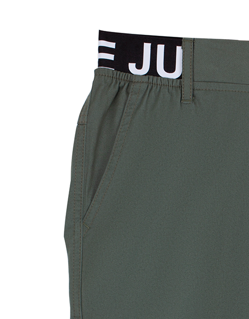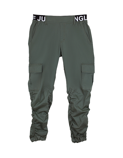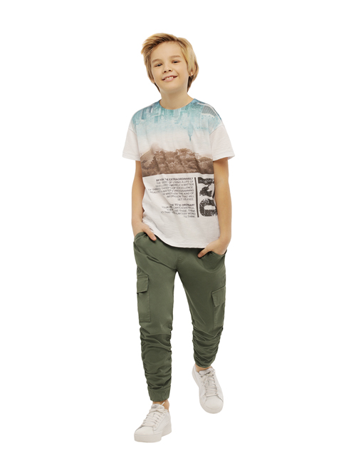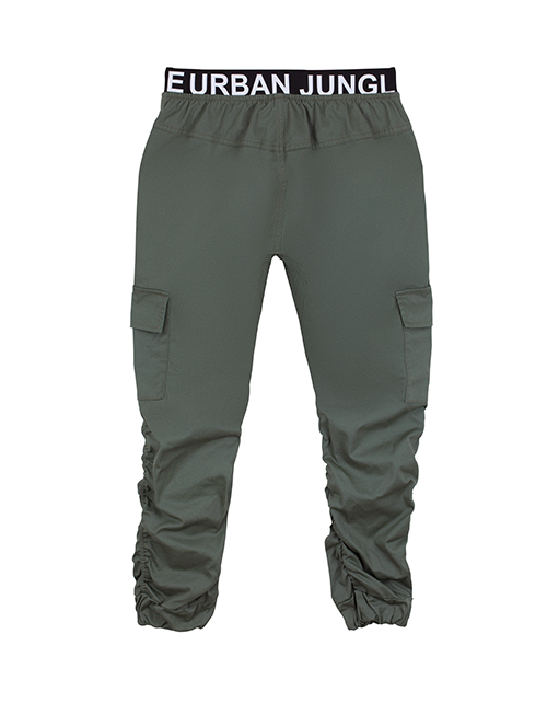 Зауженные к низу брюки для мальчика цвета хаки. Накладные карманы и притачные манжеты на резинке по низу. Принт-надпись в стилистике капсулы "Городские джунгли".