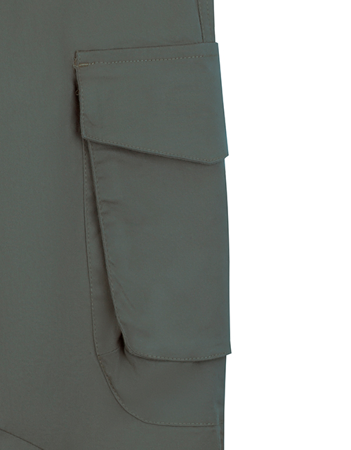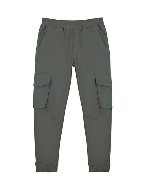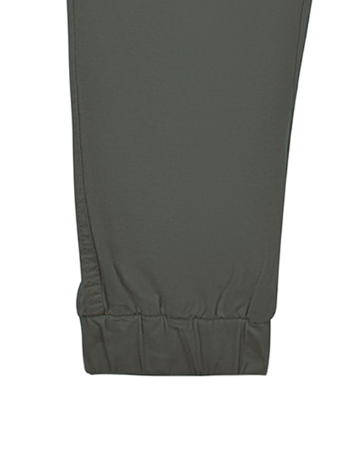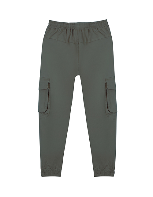 Брюки-джоггеры для мальчика цвета хаки свободного силуэта. Накладные карманы через боковой шов. Пояс и манжеты на резинке