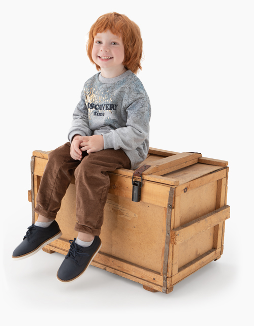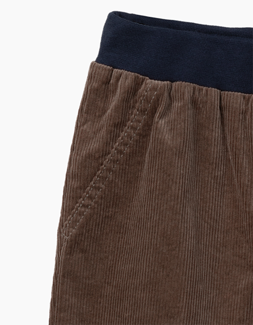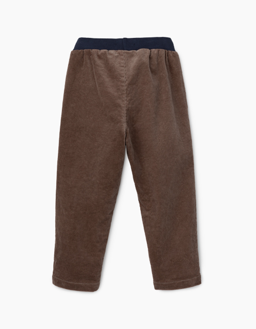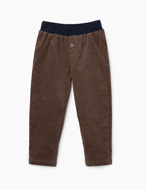 Брюки свободного прямого силуэта из коричневого вельвета на эластичном поясе из рибаны. С трикотажной подкладкой. Спереди имитация гульфика, карманов и две декоративные пуговицы
