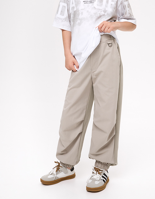 Брюки-парашюты из твила и футера с браш-эффектом - держат форму и удобны в носке. Прямой объёмный силуэт и средняя посадка обеспечивают комфорт. Эластичный пояс создаёт мягкую фиксацию, боковые карманы практичны, полукольцо добавляет утилитарный акцент.