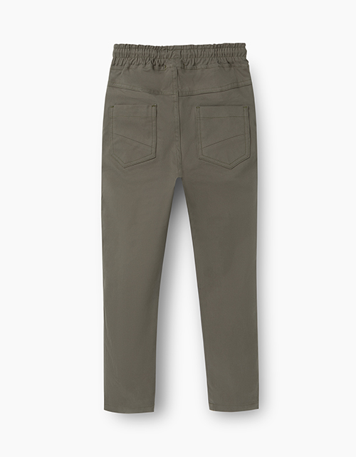 Брюки свободного, зауженного книзу силуэта для мальчика. Комфортная модель на каждый день. Выполнена из твила цвета хаки. На мягком поясе с регулировкой шнуром. Кокетка сзади, четыре функциональных кармана
