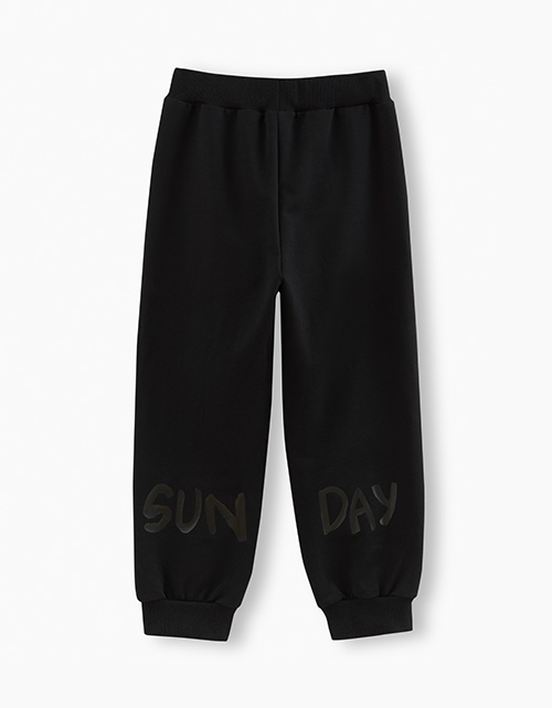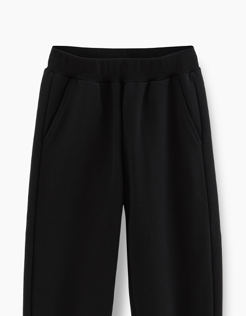 Стильные черные брюки-джоггеры для мальчика. Комфортная базовая модель прямого кроя на мягком поясе. Джоггеры со средней посадкой декорированы сзади надписи.