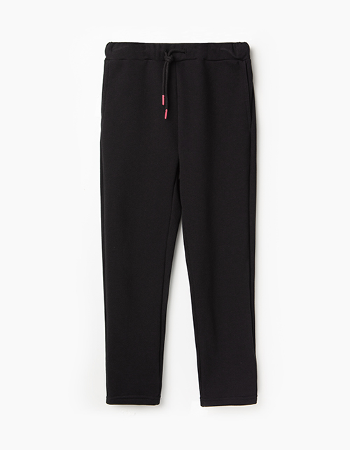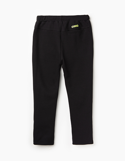 Трикотажные брюки свободного, слегка зауженного книзу фасона для мальчика-подростка. Выполнены из черного футера, напоминающего по фактуре джинс. Пояс регулируется шнуром. Сзади на кокетке справа контрастный принт OMG