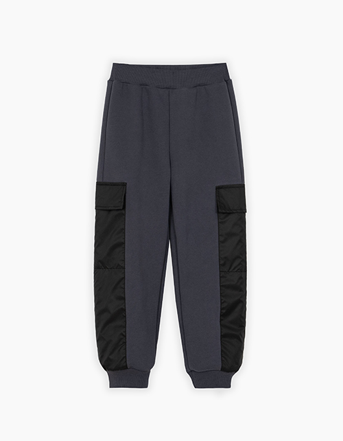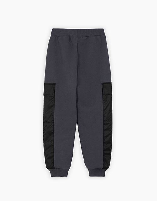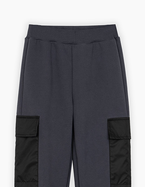 Стильные графитовые брюки-джоггеры для мальчика. Прямая модель со средней посадкой. Изделие без застёжки, на мягком поясе. Манжеты из рибаны. Брюки из приятного и бархатистого футера с накладными карманами карго и вставками из плащевой ткани.