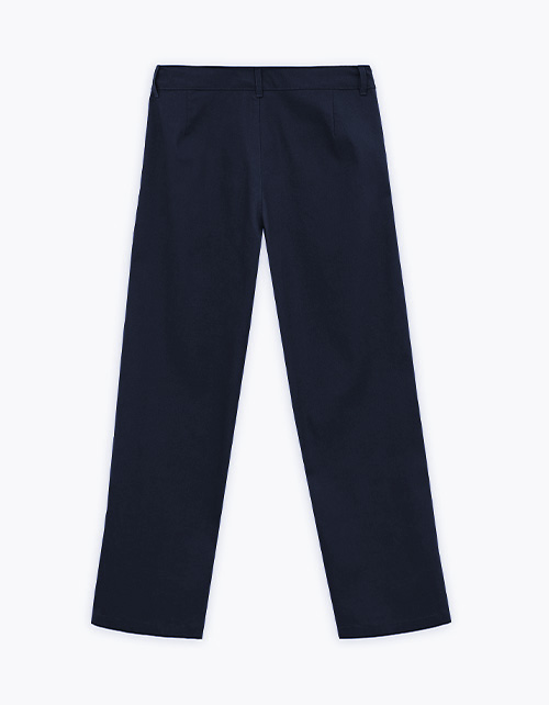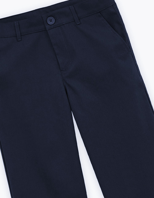 Тёмно-синие брюки из твила. Модель прямого силуэта и средней посадкой. Пояс с внутренней регулировкой. Есть шлёвки для ремня. Застёжка на молнию и пуговицу. Внутри карманы из 100% хлопка. Для улучшения характеристик, твил прошёл дополнительную обработку.