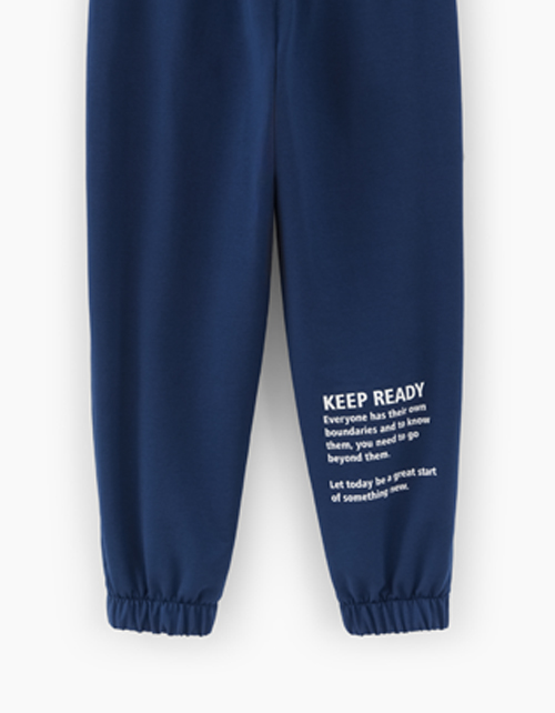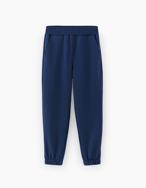 Тёмно-синие брюки-джоггеры для мальчика. Прямая модель, снизу на резинке. Базовое изделие со средней посадкой. Комфортные брюки из футера на мягком поясе.