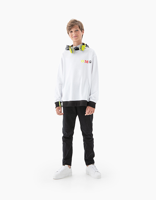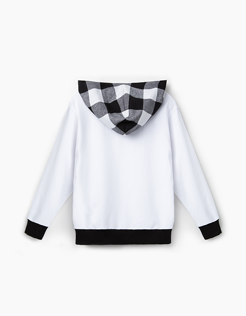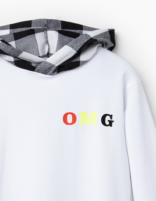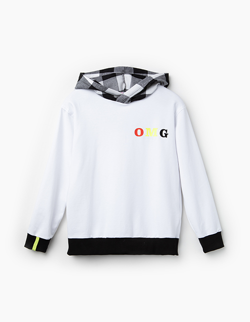 Худи с длинным рукавом для мальчика-подростка. Модель выполнена из белого футера. С капюшоном из сорочечной фланели в клетку. Манжеты и низ - из рибаны. Яркий принт OMG (аббревиатура "О, мой бог") на груди слева.