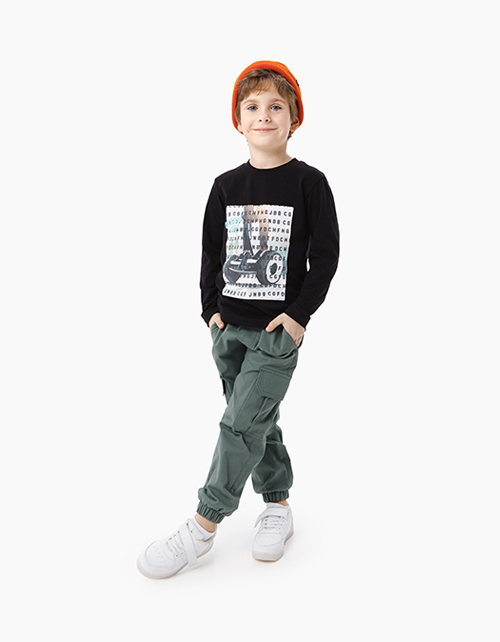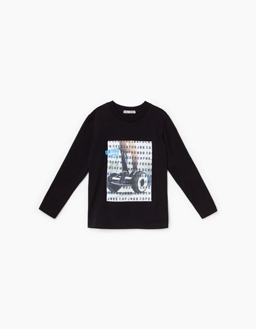 Лонгслив прямого силуэта с круглой горловиной из кулирной глади черного цвета. Спереди декорирован крупным контрастным принтом в технике фотоколлажа с изображением гироскутера и комбинаций букв латинского алфавита
