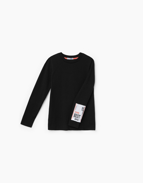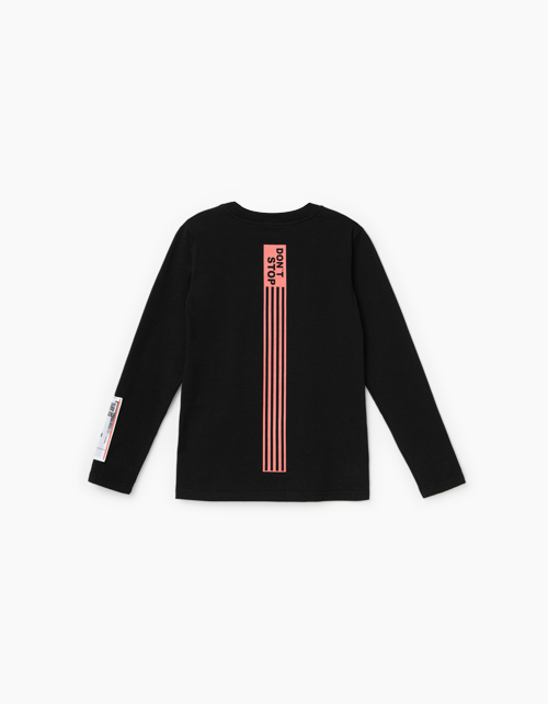 Лонгслив прямого силуэта с круглой горловиной для мальчика-подростка выполнен с отделкой из рибаны. Декорирован белой нашивкой с контрастным принтом на левом рукаве. На спинке - текстово-графический трансфер из пленки кораллового цвета
