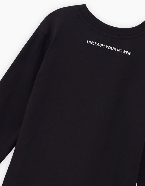 Чёрный лонгслив. Актуальная прямая расслабленная модель с авторским лаконичным мотивационным принтом. Эластичная горловина из рибаны. Универсальная базовая модель, которая легко комбинируется и подходит для разных сфер носки: от спорта до прогулок.