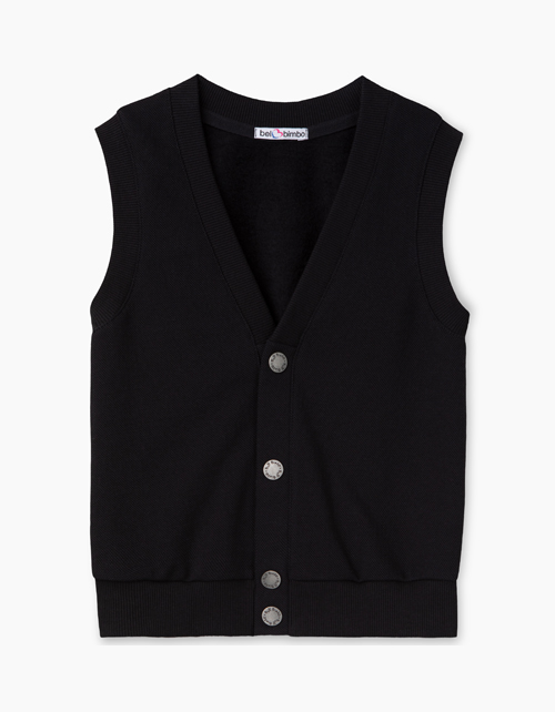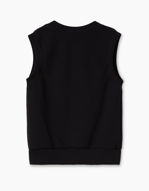 Черный жилет полуприлегающего силуэта. Горловина, пройма и низ изделия оформлены рибаной. Выполнен из трикотажа со особенным переплетением нити - пике. Застегивается на кнопки.