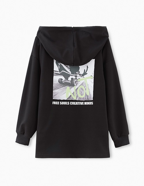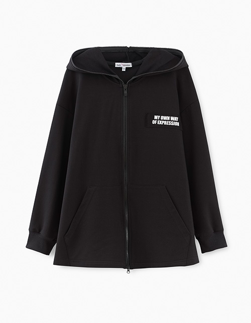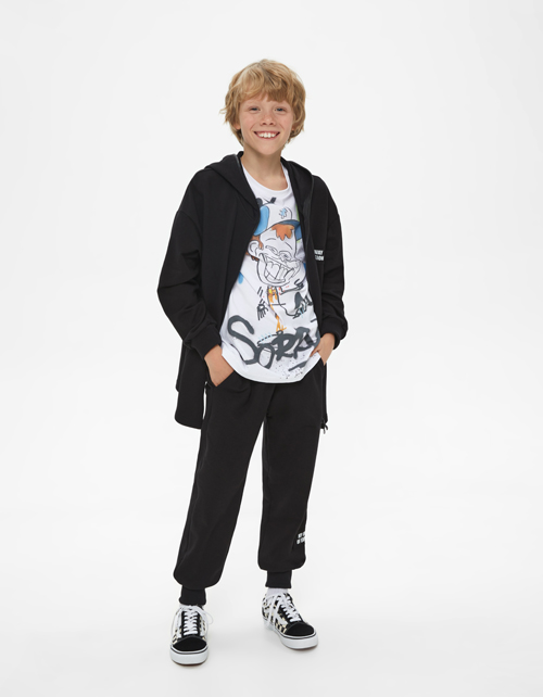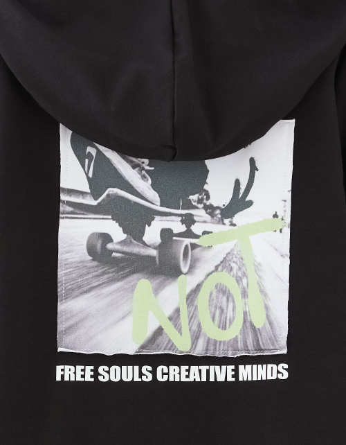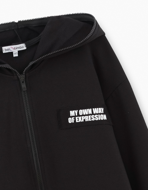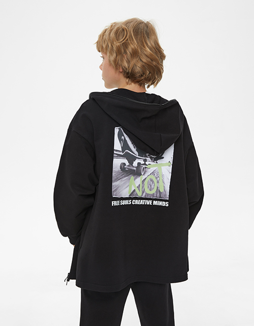 Чёрное худи на молнии для мальчика. Модель прямого расслабленного силуэта. Худи с капюшоном и молнией по всему изделию. Акцентный декор на спинке.