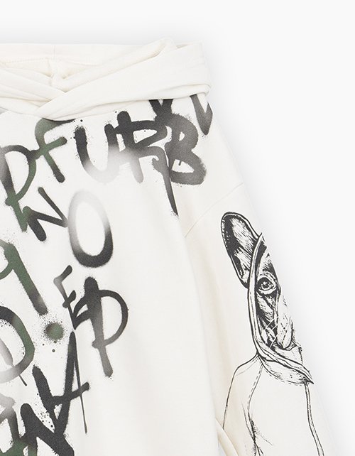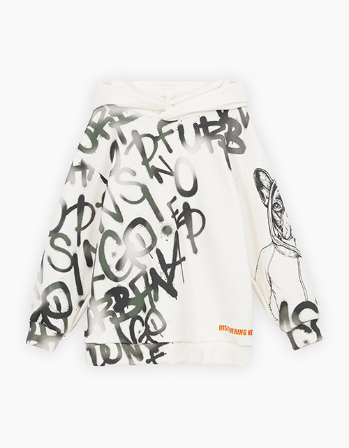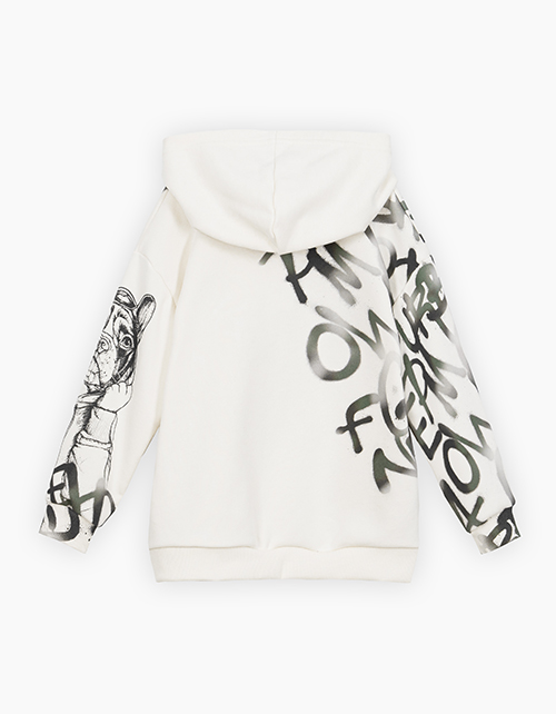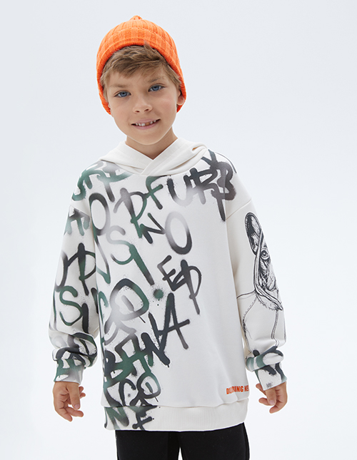 Стильное худи с капюшоном для мальчика. Модель прямого расслабленного силуэта со спущенной линией плеча. Низ и манжеты из рибаны. Худи ассиметрично декорировано авторским принтом в стиле граффити.