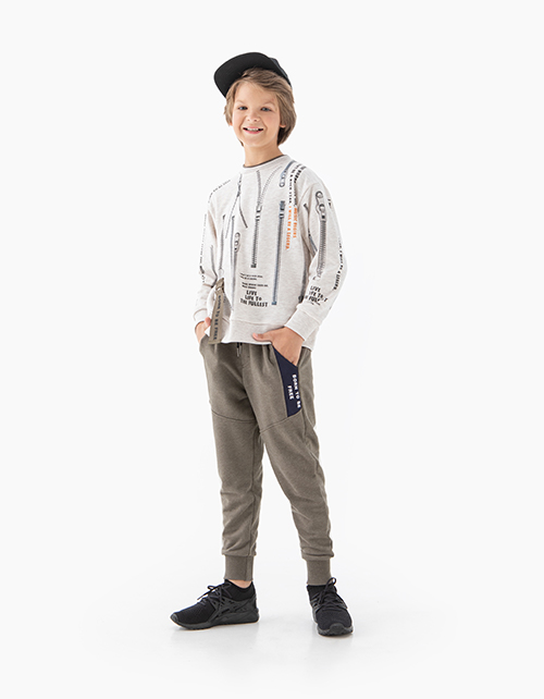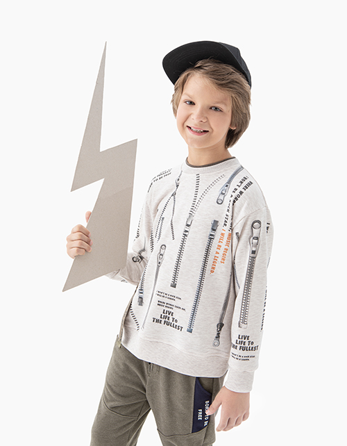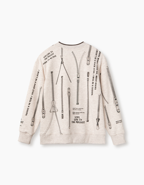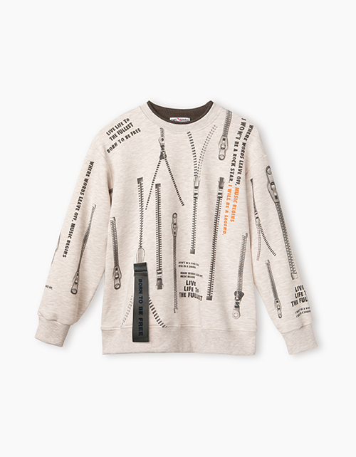 Джемпер из бежевого меланжевого футера для мальчика-подростка. Прямой силуэт, спущенное плечо. Контрастные акценты. Модель запечатана хаотично расположенными изображениями застежек-молний и фраз в стилистике капсулы